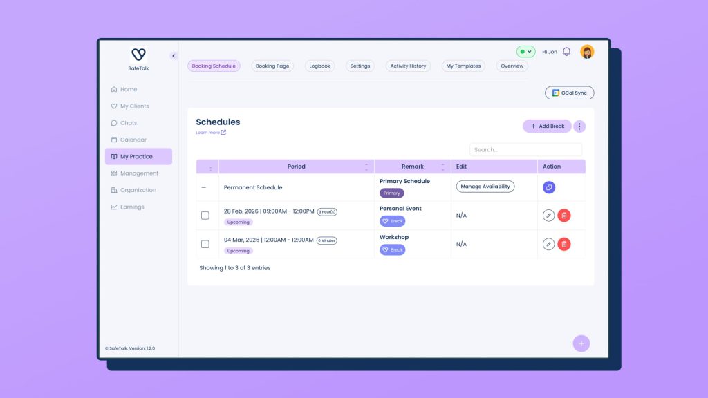 Running a therapy practice involves coordinating schedules, maintaining accurate records, managing client information, and ensuring professional consistency. The My Practice section in SafeTalk brings everything together into one structured workspace, giving individual therapists and organizations a centralized way to manage daily operations clearly and efficiently.