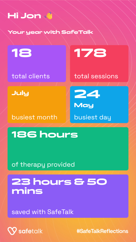 We are super excited to share that SafeTalk Reflections are returning in December(early December), available to both therapists and clients, giving you a visual look at the journey you’ve taken in 2025 with SafeTalk.