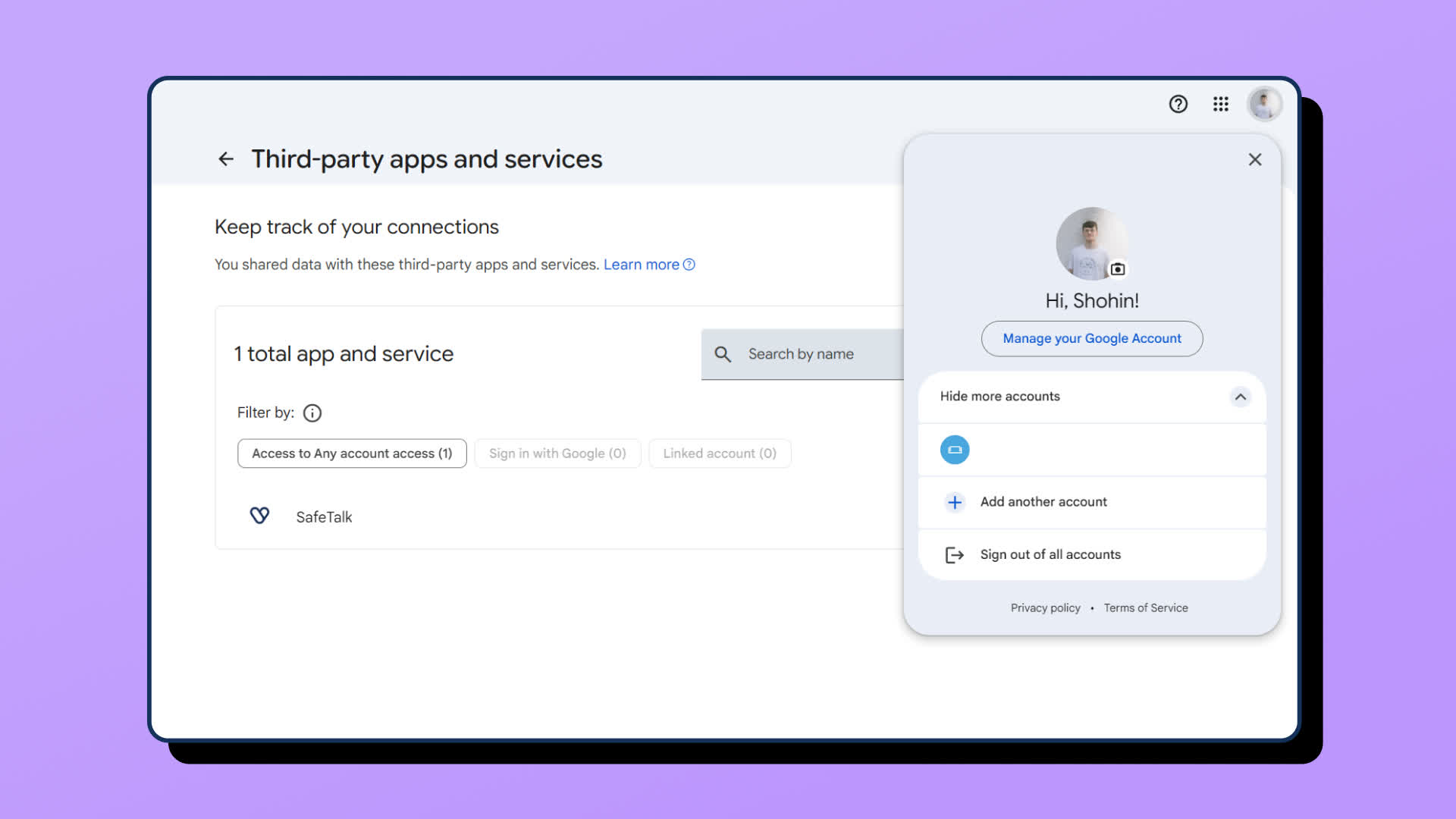 - Once you have switched to the correct account, in the middle of the screen, under “total apps and services” you should be able to see “SafeTalk” (refer to screenshot above). If “SafeTalk” does not appear in your apps and services, means your previous connection has already been removed. You can jump into step 2.