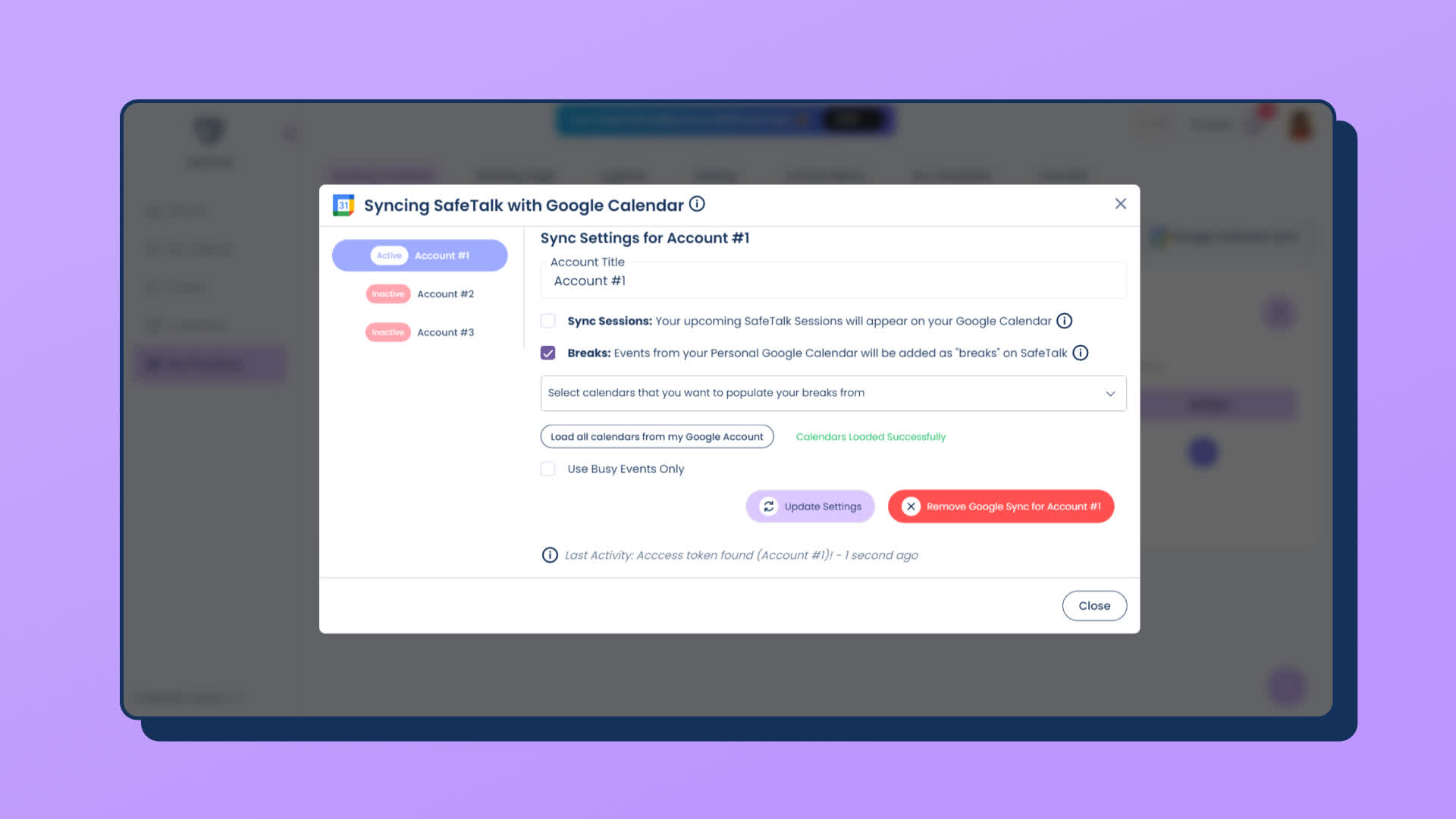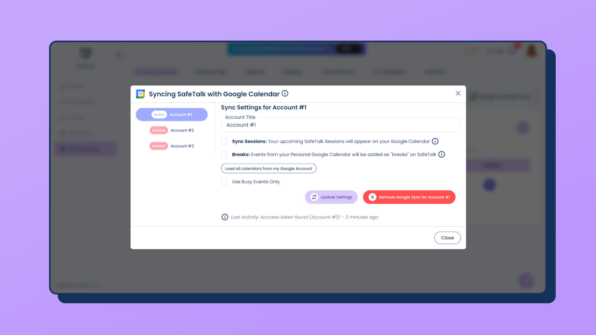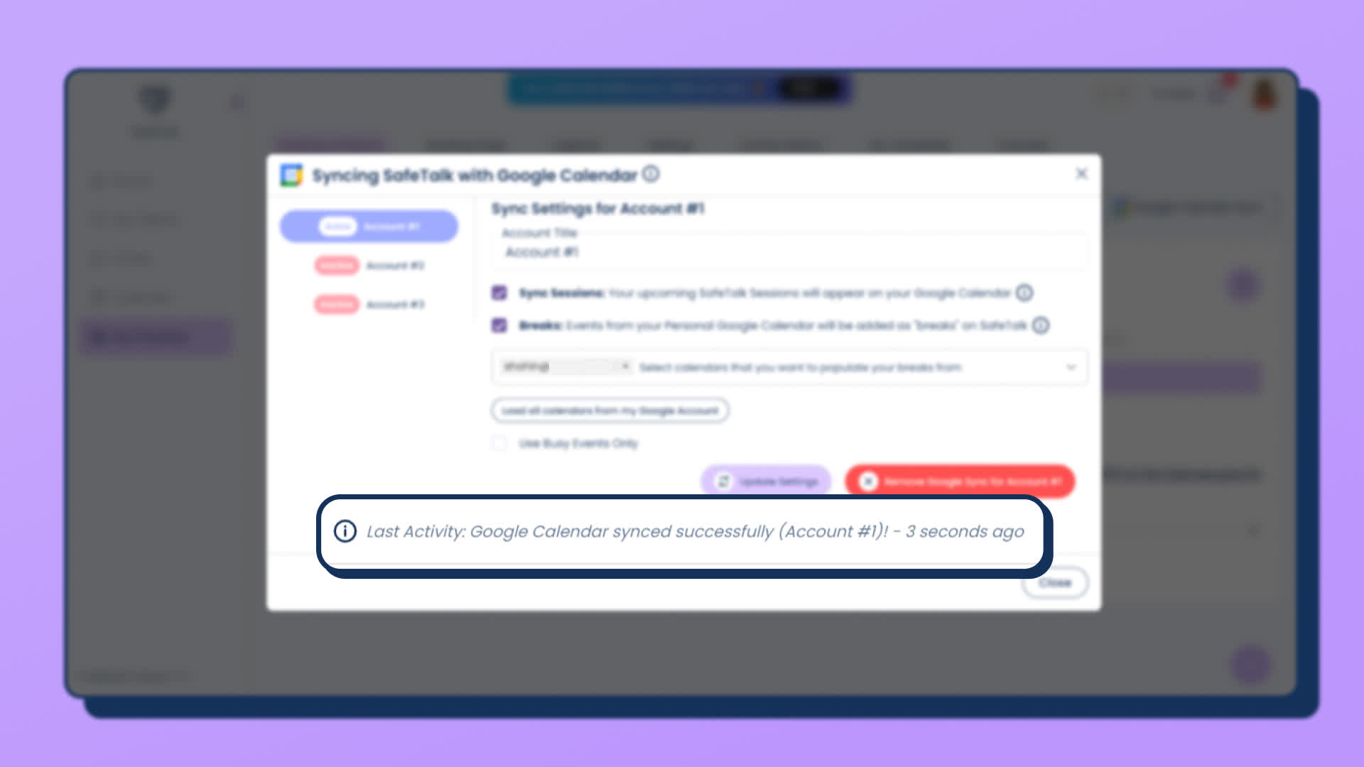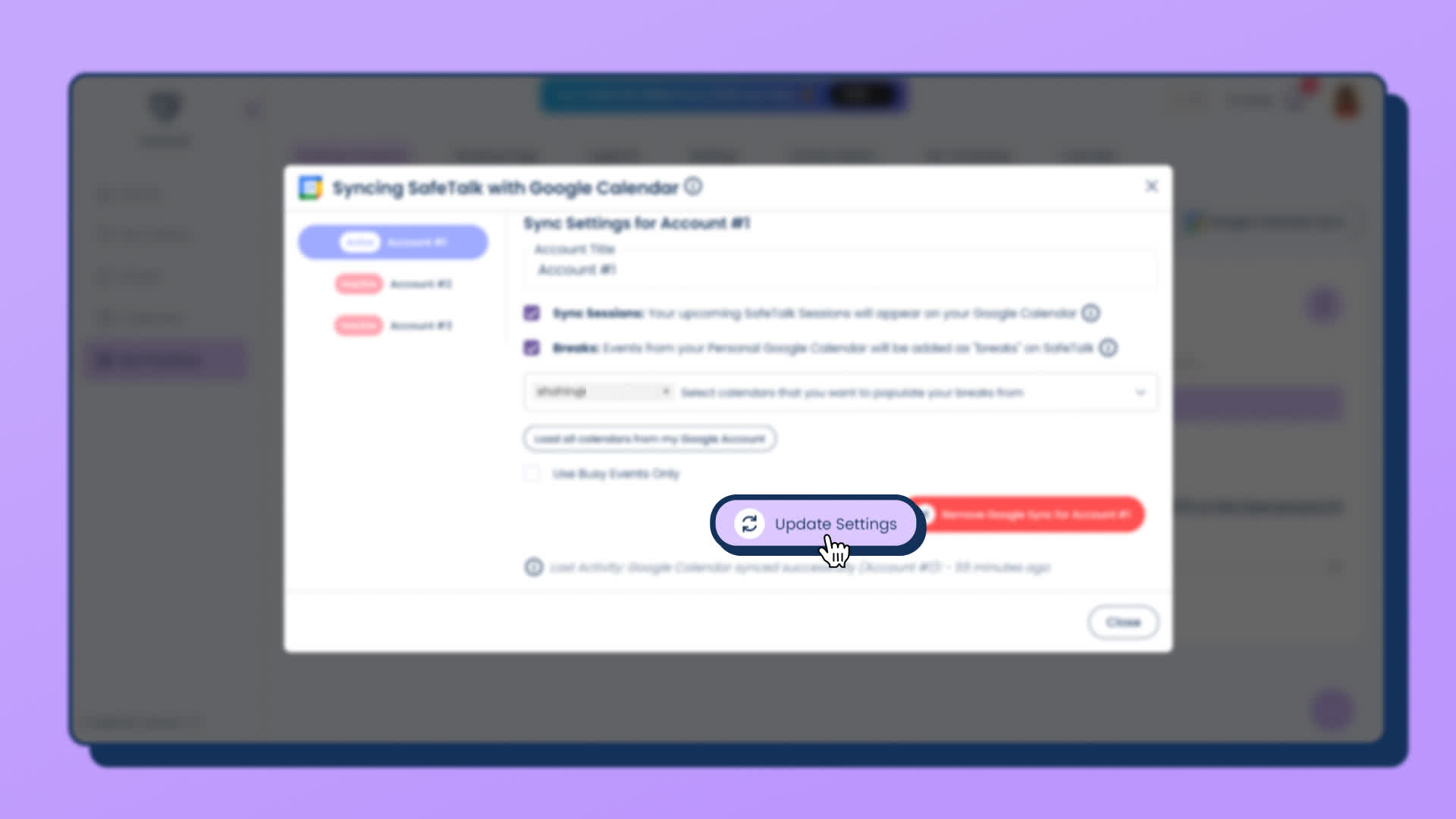 - After you have configured the sync options(previous 3 steps), click on “Update Settings” & the data between your Google Calendar & SafeTalk account will be synced.