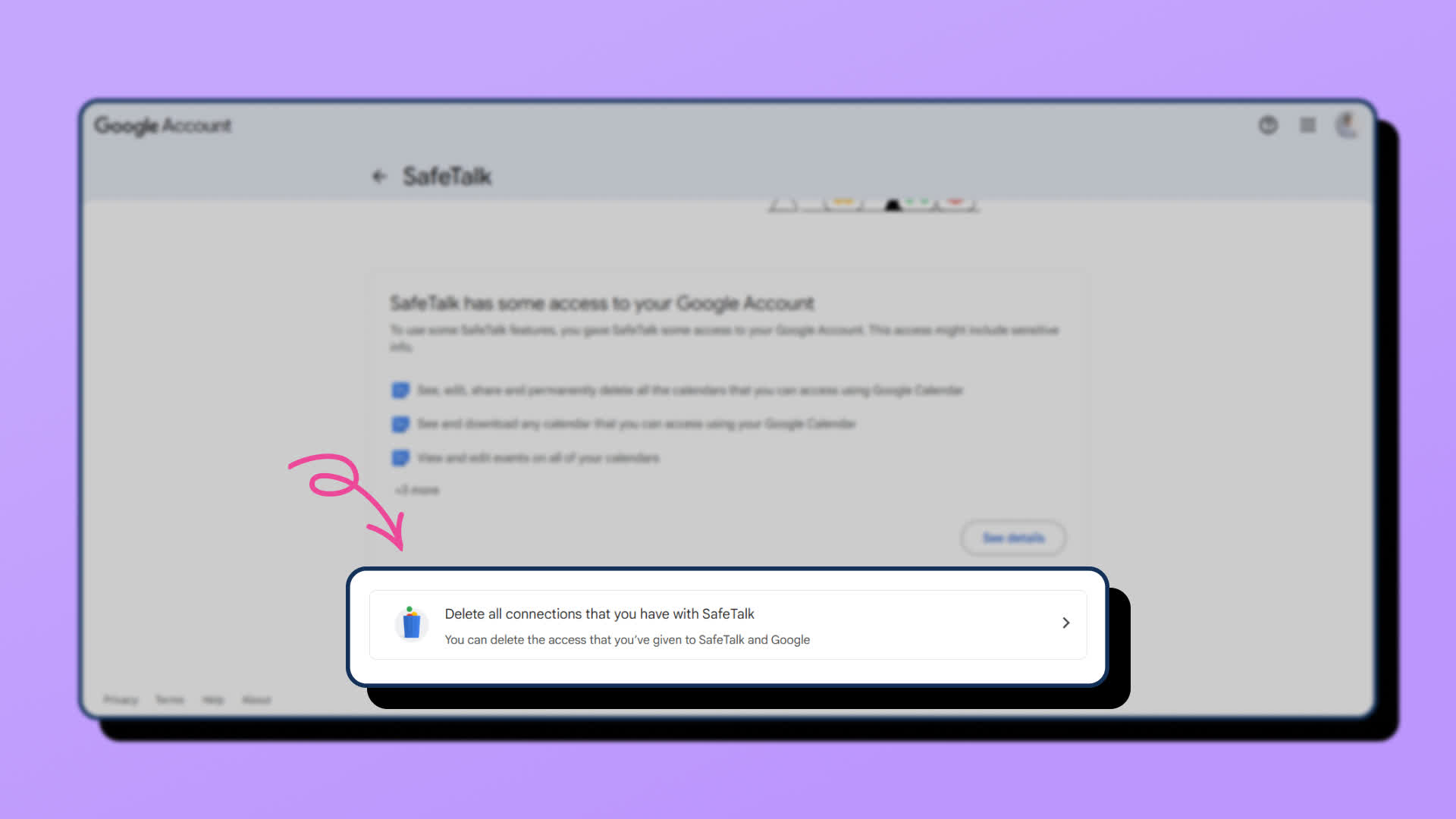 - If SafeTalk is there under “total apps and services”, click on “SafeTalk”, a new page will open, scroll all the way to the bottom of the page and click on “Delete all connections that you have with SafeTalk”