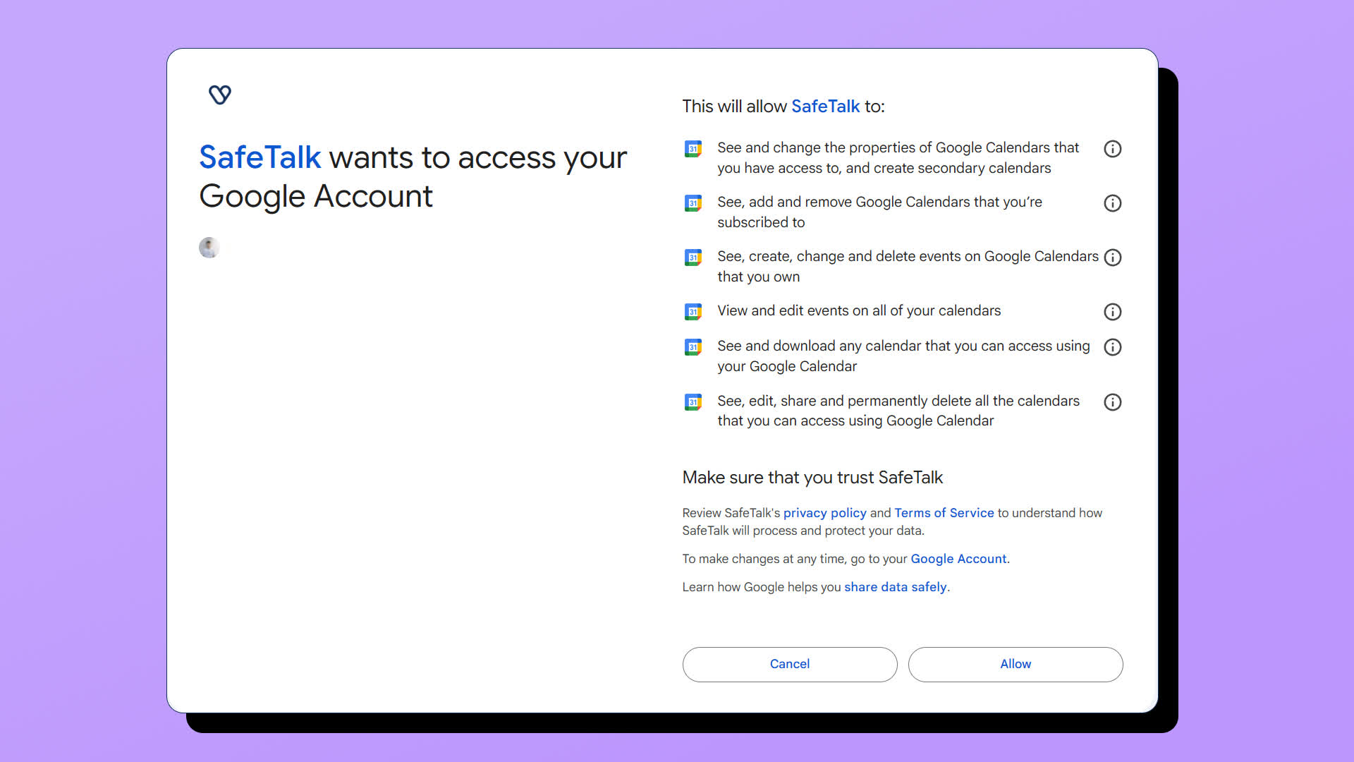 - Next, you will be redirected to a “Sign in with Google” page(screenshot below). Make sure to select “Allow” to give SafeTalk permission to connect with your Google Account.