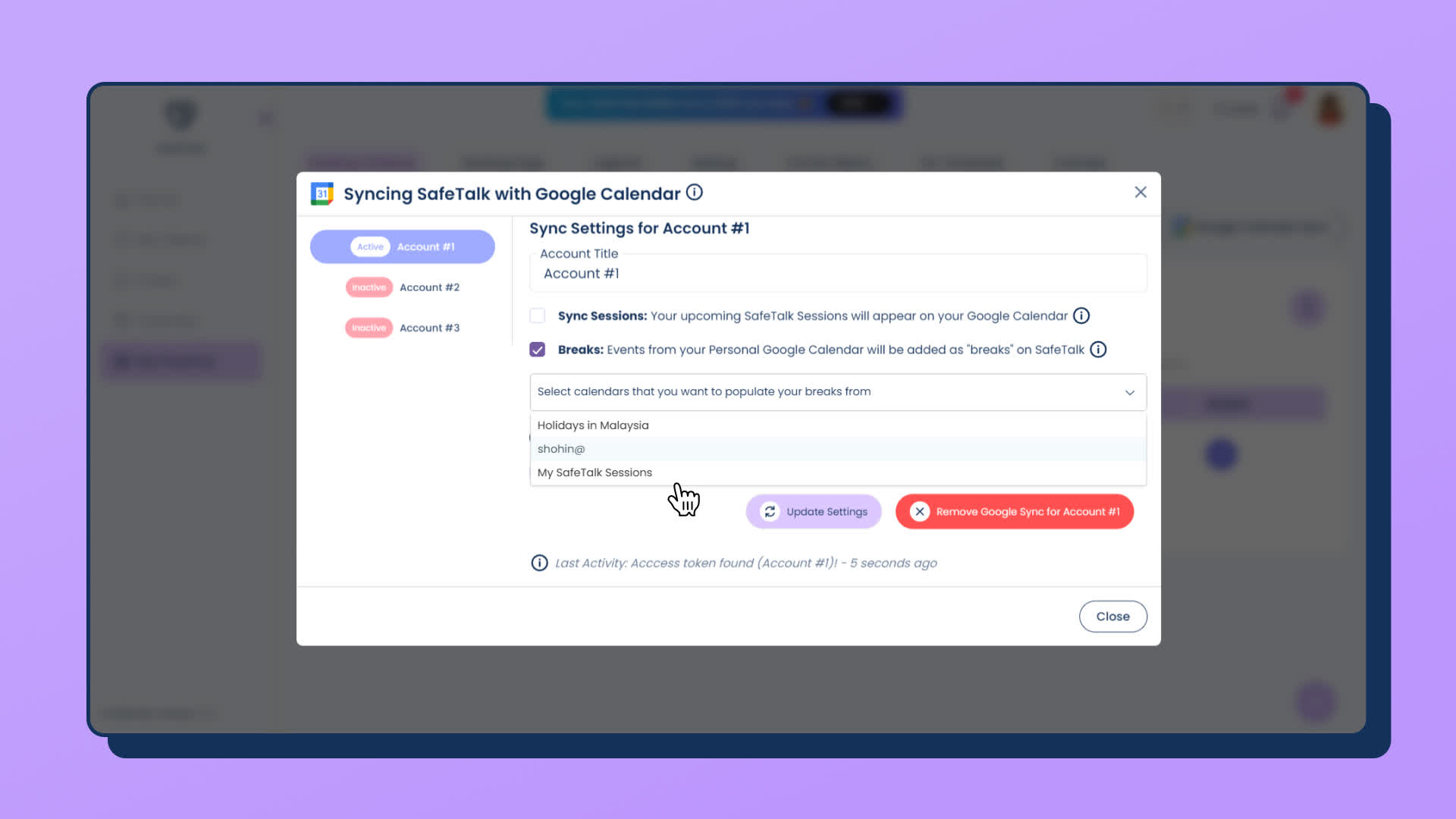 - After you click “Allow”, you will be redirected back to your SafeTalk account. Click “Google Calendar Sync” button on top right again, and you will see the the settings for the connection(screenshot below)